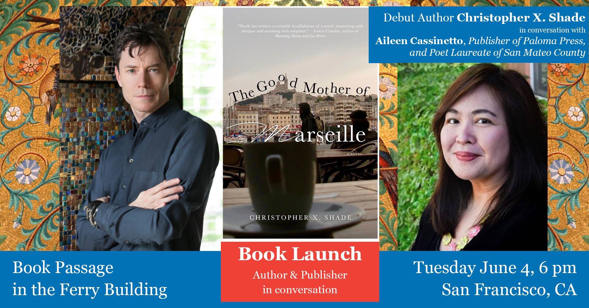 Join us on June 4, 2019 at 6pm at Book Passage Ferry Building for an author-publisher conversation to celebrate the publication of Christopher X. Shade’s debut novel The Good Mother of Marseille, a story of Americans searching the French port city of Marseille for themselves. The author will be in conversation with Aileen Cassinetto, who is publisher of Paloma Press and Poet Laureate of San Mateo County, discussing the book, the importance of art and experience across borders, and the influences of poetry in our lives and work.