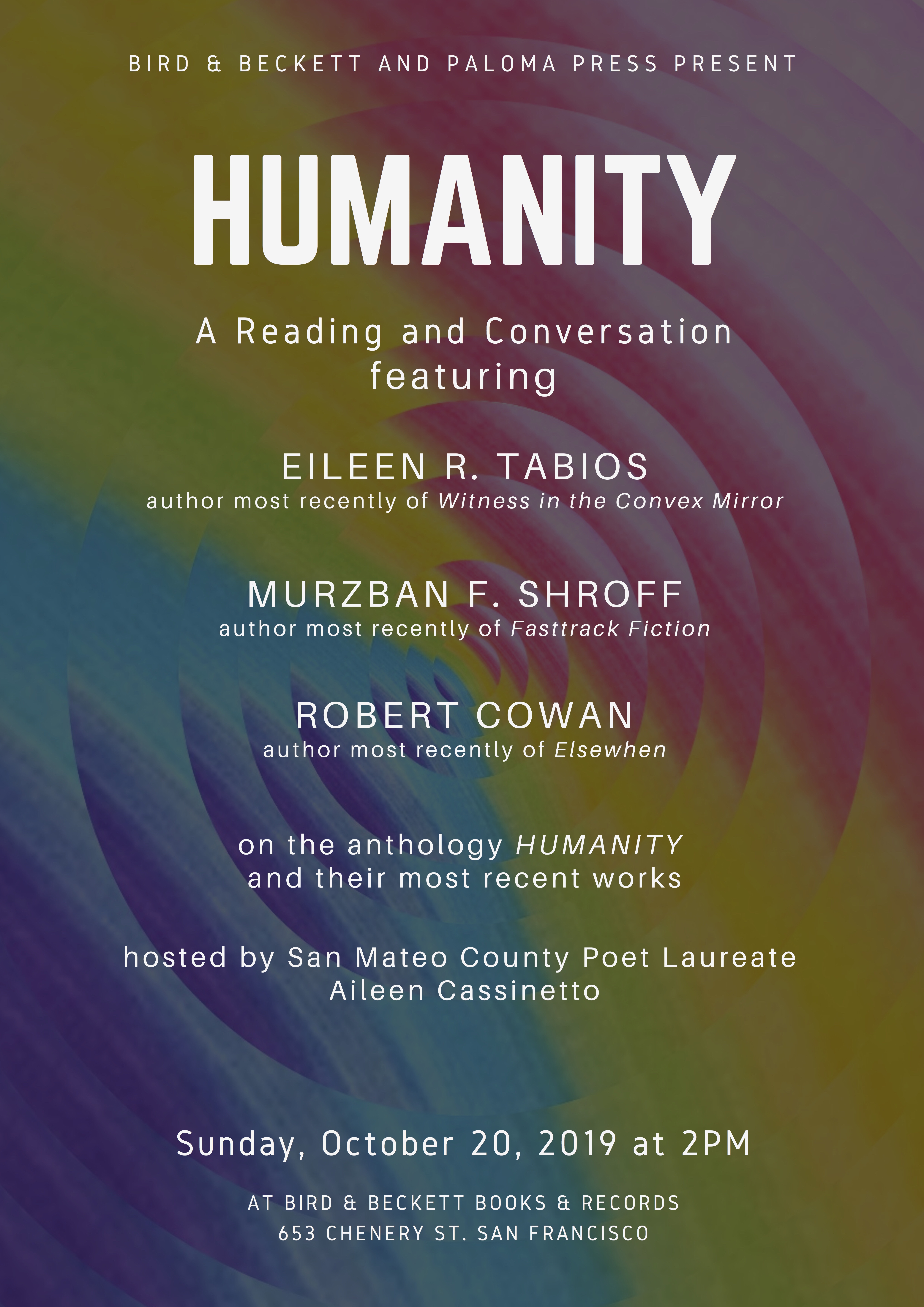“What, in this human condition, is worthwhile?” A reading and conversation with St. Helena-based author Eileen Tabios, Mumbai-based author Murzban Shroff, and New York-based author Robert Cowan.