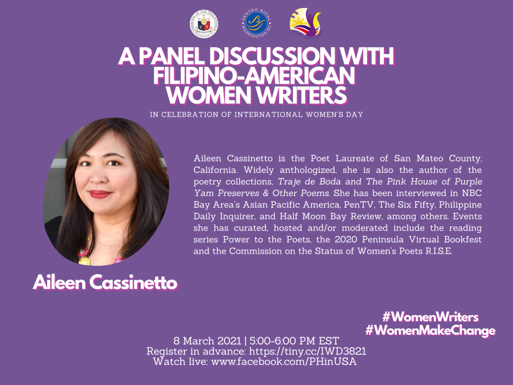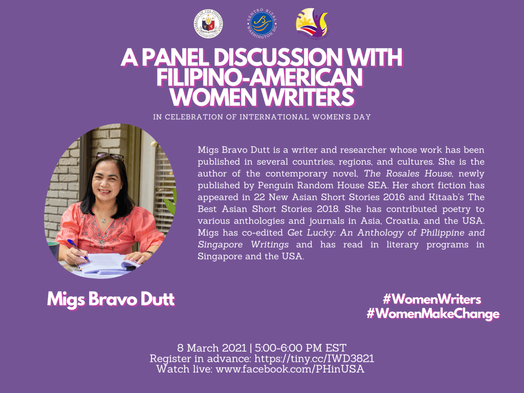 In honor of International Women’s Day, the Philippine Embassy in Washington DC is hosting a panel discussion on Monday, March 8 at 2pm Pacific / 5pm Eastern, featuring Filipino women writers Cecilia Manguerra Brainard, Migs Bravo Dutt, Dr. Luisa A. Igloria and Gayle Romasanta. The event will be moderated by Aileen Cassinetto, and will stream live on the Embassy’s Facebook page: @PHinUSA