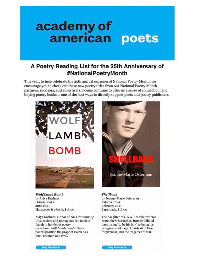 From the Academy of American Poets, “This year, to help celebrate the 25th annual occasion of National Poetry Month, we encourage you to check out these new poetry titles from our National Poetry Month partners, sponsors, and advertisers. Poems continue to offer us a sense of connection, and buying poetry books is one of the best ways to directly support poets and poetry publishers.” Full list here.