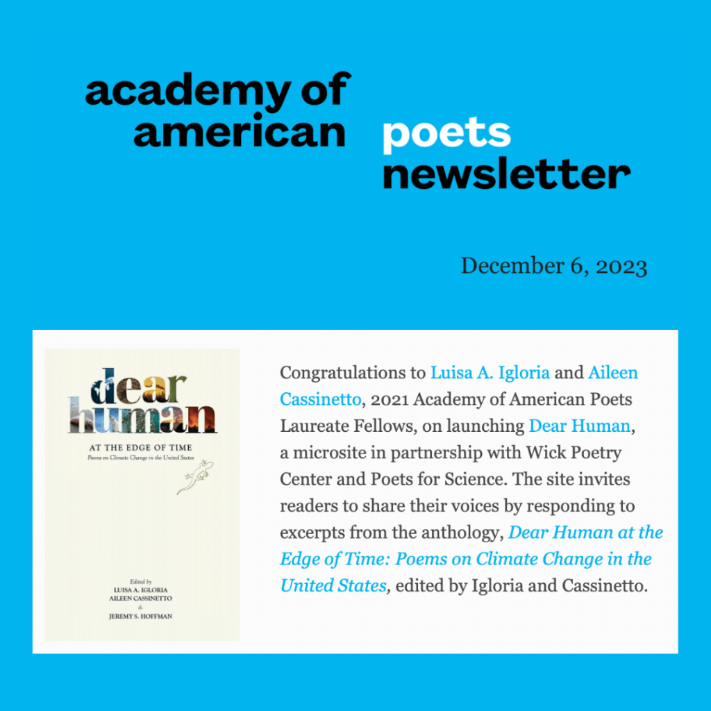 Congratulations to Luisa A. Igloria and Aileen Cassinetto, 2021 Academy of American Poets Laureate Fellows, on launching Dear Human, a microsite in partnership with Wick Poetry Center and Poets for Science. The site invites readers to share their voices by responding to excerpts from the anthology, Dear Human at the Edge of Time: Poems on Climate Change in the United States, edited by Igloria and Cassinetto.