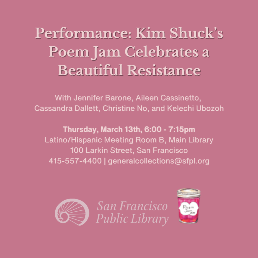 Poem Jam with San Francisco Poet Laureate Emerita Kim Shuck featuring Jennifer Barone, Aileen Cassinetto, Cassandra Dallett, Christine No, and Kelechi Ubozoh