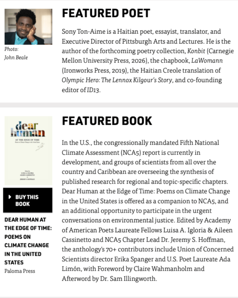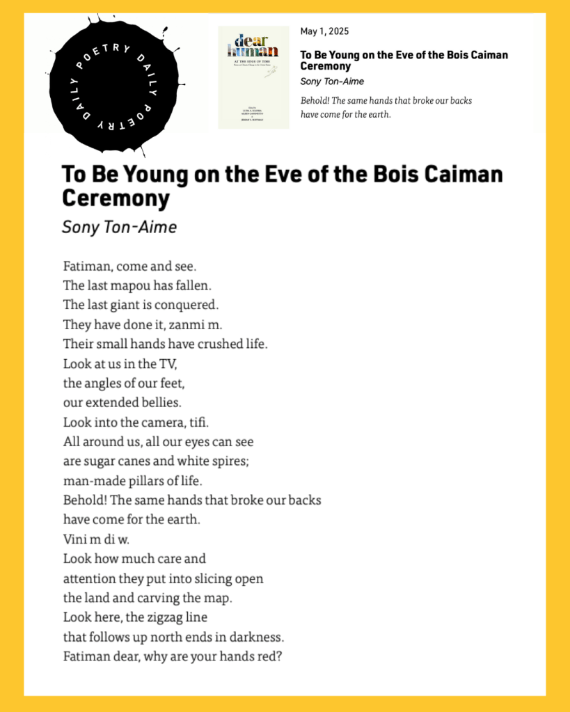Sony Ton-Aime’s visionary poem, “To Be Young on the Eve of the Bois Caiman Ceremony,” which was first published in Dear Human at the Edge of Time, edited by Luisa A. Igloria, Aileen Cassinetto, and Jeremy S. Hoffman as a companion to the Fifth U.S. National Climate Assessment (NCA5), appears in POETRY DAILY! This is Paloma Press’ first time to be featured in the anthology, and we are grateful for this incredible honor.