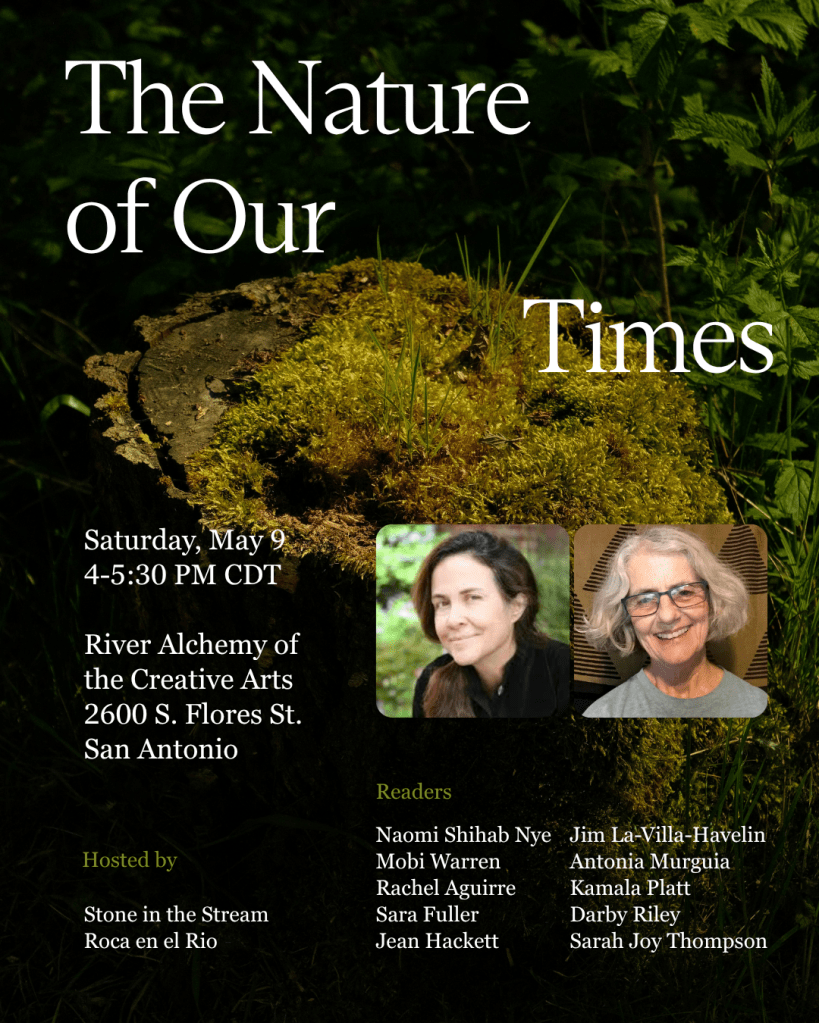 Join The Nature of Our Times contributors Naomi Shihab Nye and Mobi Warren along with poets Jim La-Villa-Havelin, Rachel Aguirre, Jean Hackett, Sarah Joy Thompson, Kamala Platt, Sara Fuller, Antonia Murguia, and Darby Riley in a reading and celebration hosted by Stone in the Stream/Roca en el Rio on May 9th at 4pm at the River Alchemy of the Creative Arts, San Antonio. Free raffle for copies of the anthology plus eco-puppets!